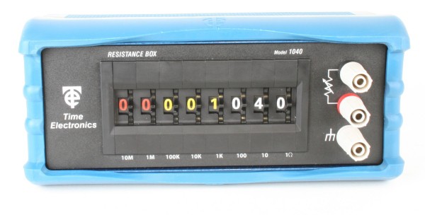The 1040 is compact and durable, housed in a robust metal case with removable protective rubber cover, making it ideal for use in either the laboratory or field. Excellent accuracy (mid-scale 0.1%) is achieved by using high stability metal film resistors. The 8-digit thumbwheel switch enables simple and precise setting with a clear indication of the resistance value.