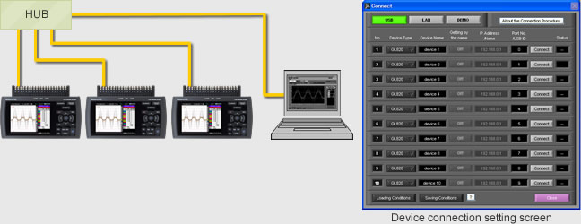 Up to 10 units or 500 channels can be connected to 1 PC through LAN or USB. Measurements can be performed simultaneously or independently.