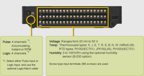 The standard configuration has 20 analogue input channels. It can be expanded up to 200 channels by adding optional 20 channelextension terminal kits.