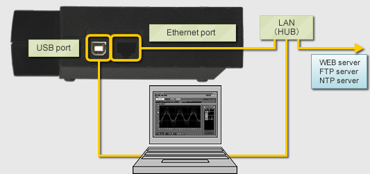 The WEB & FTP server function, FTP client-server function and NTP client function are supported when the GL820 is connected to the LAN via the Ethernet port.