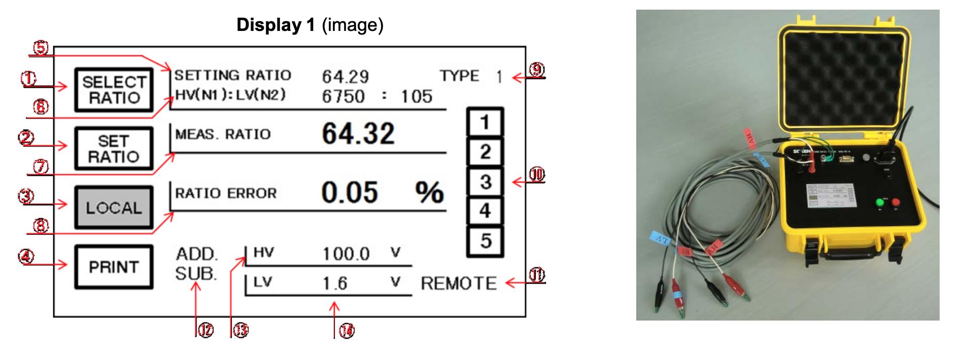 Max 10 transformer types can be registered and numbered from 1 to 10, and Max 5 ratios can be registered for every type. Each of 5 ratios is displayed on a screen and can be selected by touching the number from 1 to 5. (Ref. display 2)