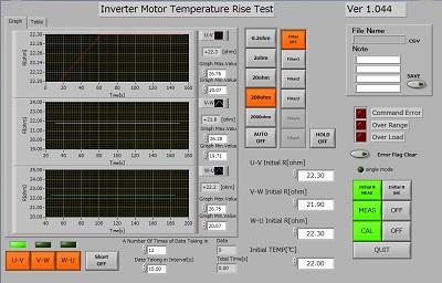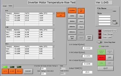 Generally, either the temperature measuring method which measures a partial temperature by using temperature sensor, or the resistance method which measures resistance and converts it by using temperature coefficient, is introduced to the temperature rise test of the motor. Comparing these 2 methods, the former one is easily influenced by environmental temperature. DAC-HRI-3, introducing the later method, can measure the resistance of the coil windings directly and obtain precise resistance values. Besides, DAC-HRI-3 can measure resistance without turning off the power, it enables you to have the true temperature of a whole driven motor coil efficiently.