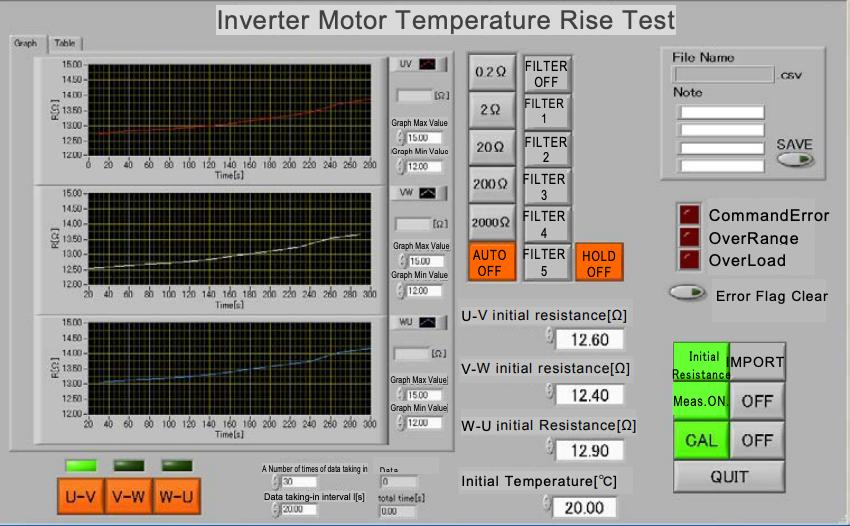 During the temperature rise test of a coil, in particular, a coil of small-size equipment cools rapidly once de-energized, and so its resistance changes considerably. In other words, it is very difficult to accurately measure the coil resistance of a running motor. In the case of the coil of a motor that is equipped with a fan, the motor exterior is cooled by the fan, but the temperature of the coil inside the motor can be much higher. In this case, the motor temperature that is measured externally with, for example, a thermistor, can be much different from the temperature of the coil. The traditional “measurement of coil resistance after shutdown” is based on the assumption that the temperature rises and falls in accordance with natural logarithm, but the assumption often fails for products of complicated structure, and differences or errors are inevitable in inferring the coil resistance under the energized state from that under the de-energized state. Therefore, hot-line resistance measurement is an ideal method for correct measurement of coil resistances.